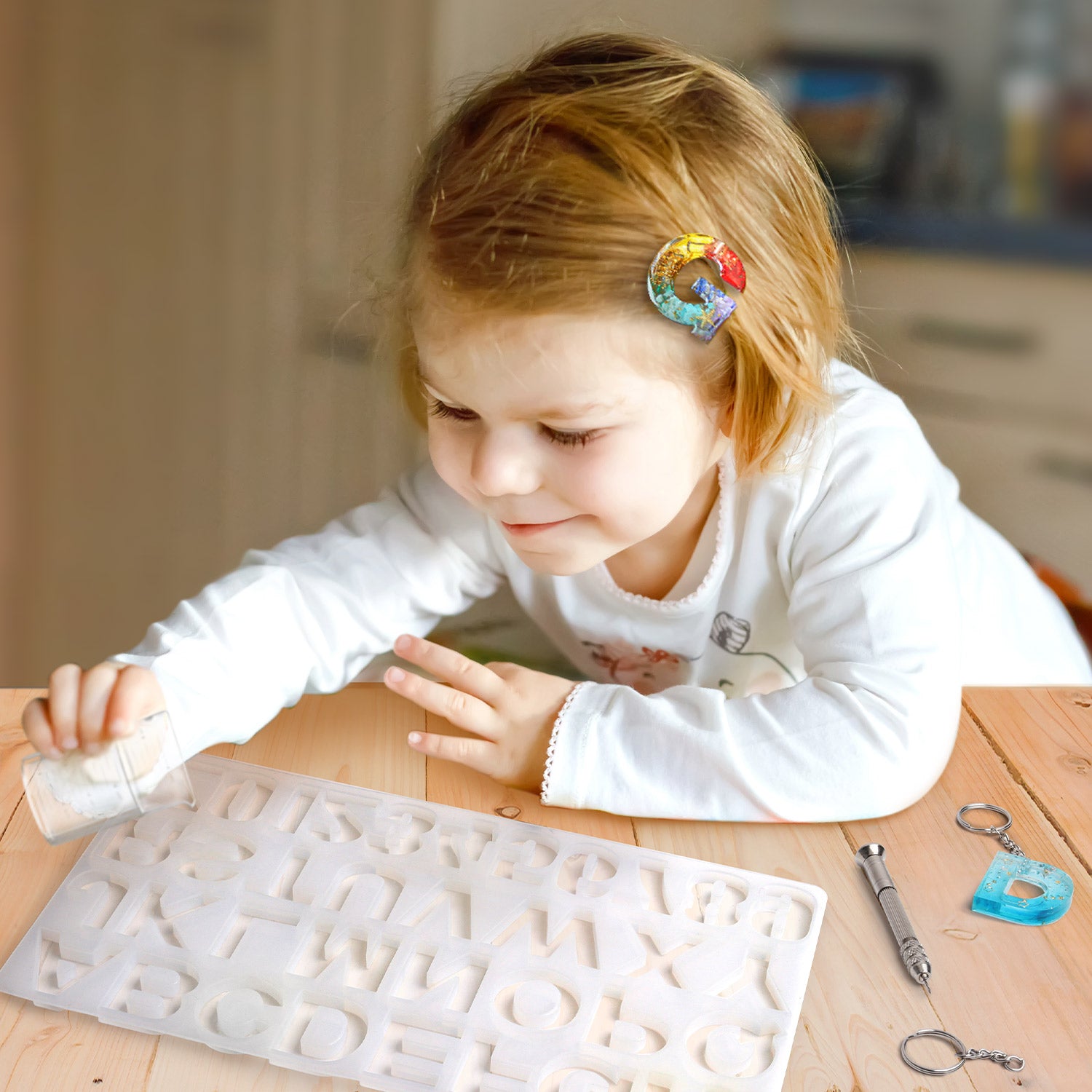 Mocoosy 134Pcs Alphabet Keychain Resin Molds Kit, Reversed Letter Number Silicone Mold Epoxy Resin Casting Molds Key Chain Making Set with 1 Hand Drill 2 Drill Bits 30 Key Rings 100 Screw Pin
