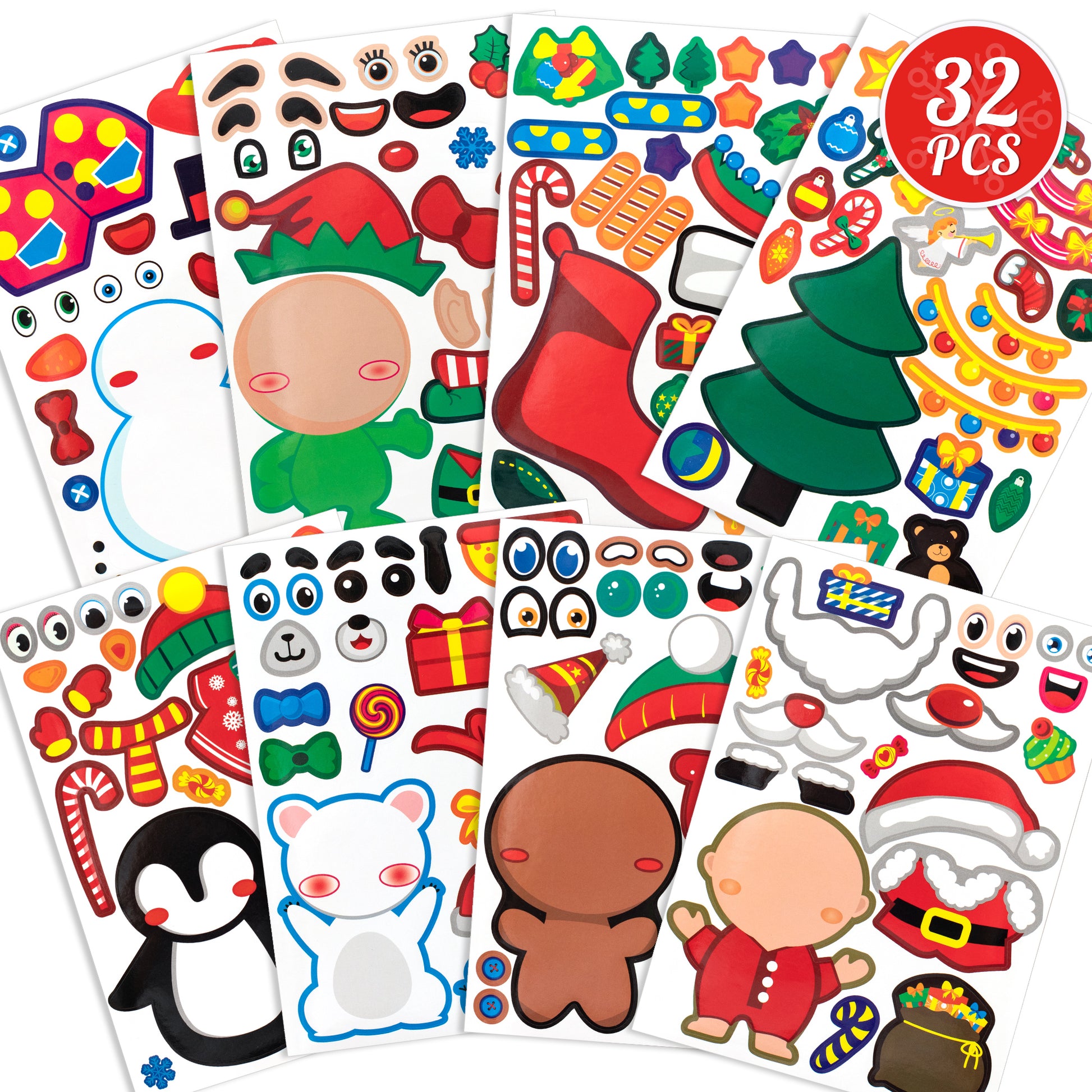 Mocoosy 32PCS Christmas Make a Face Sticker Sheets for Kids, Make Your Own Christmas Characters Stickers, Xmas Stickers with Elf, Santa, Snowman, Penguin and More Christmas Party Favor Craft Supplies